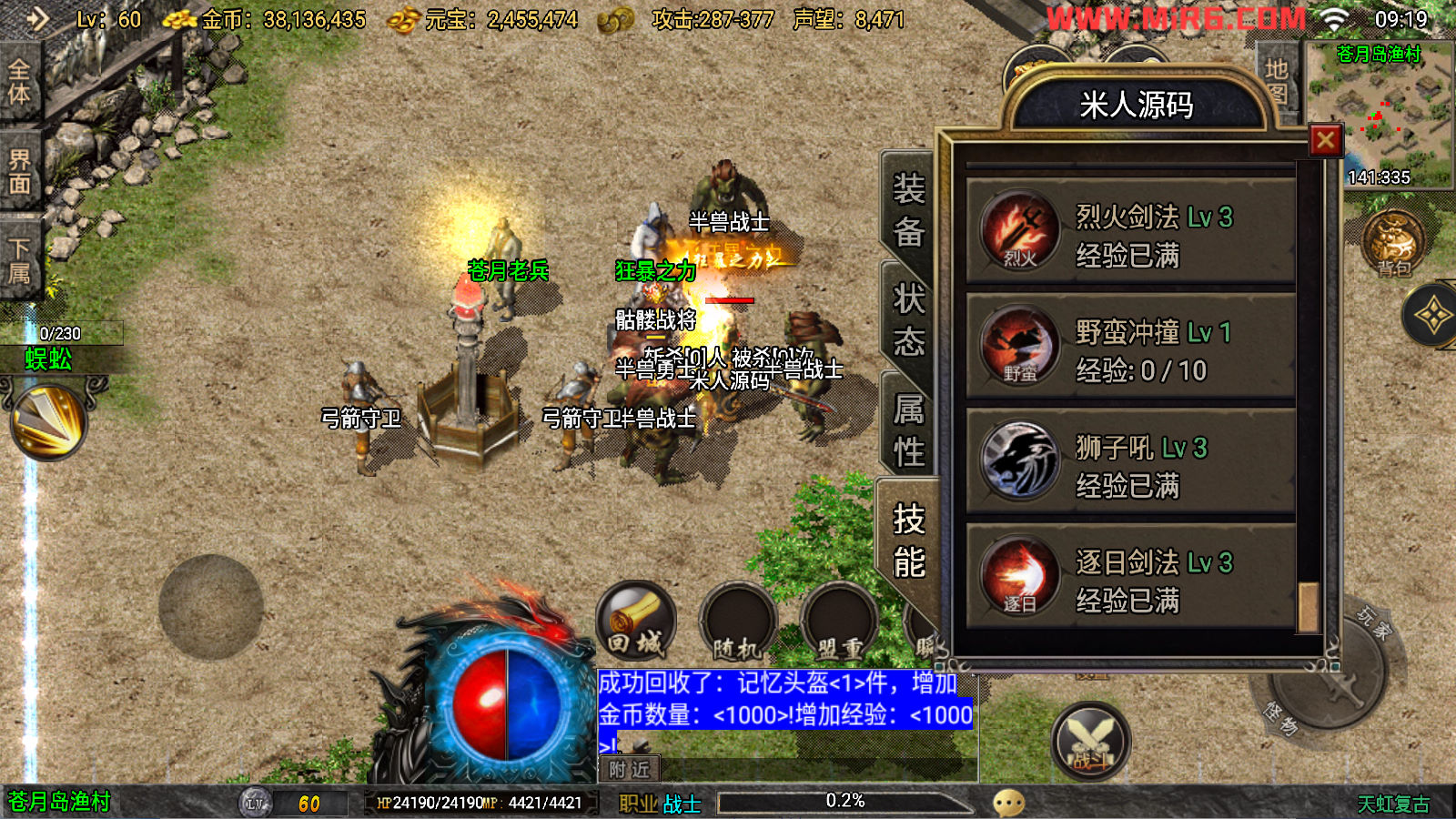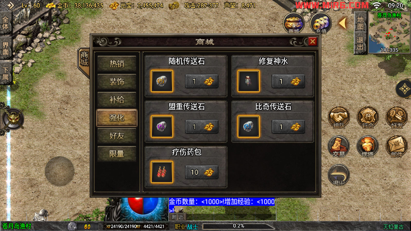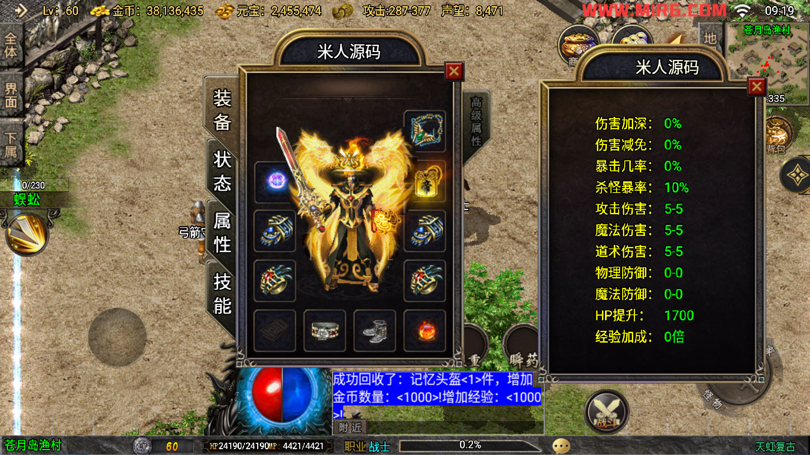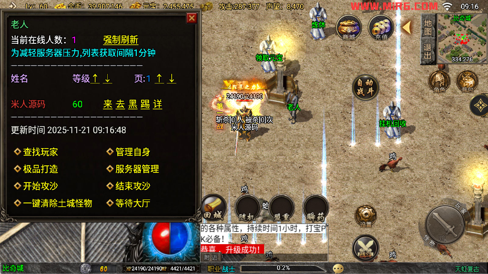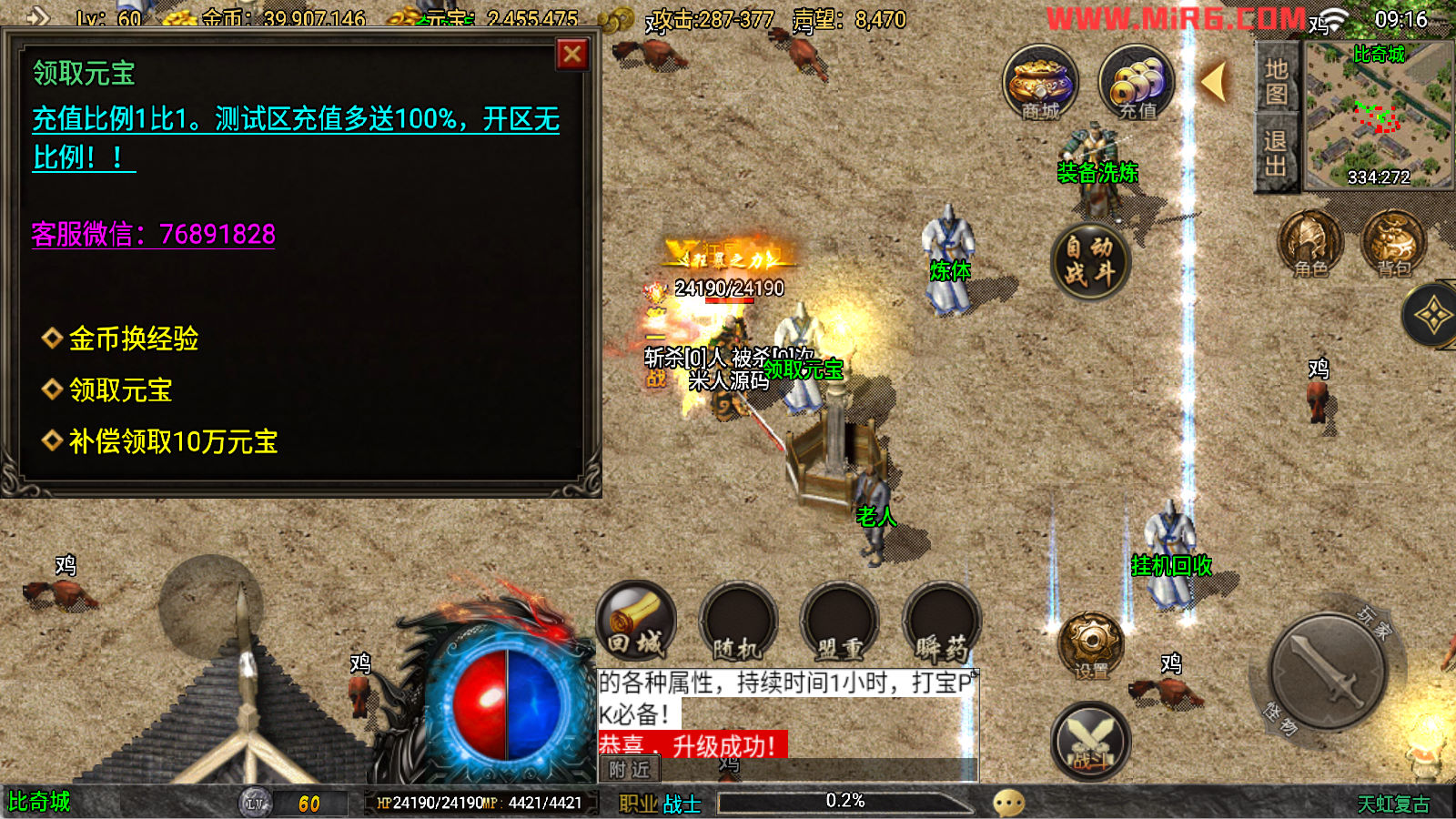 下面我们来测试下游戏里的功能看看吧。好了,其他功能就自行测试吧。更多的游戏资源可以访问www.MiR6.com下载,我们每款游戏资源均单独制作了独立的视频架设教程,让小白也可以快速上手游戏架设。快来体验自己做GM的乐趣吧!
