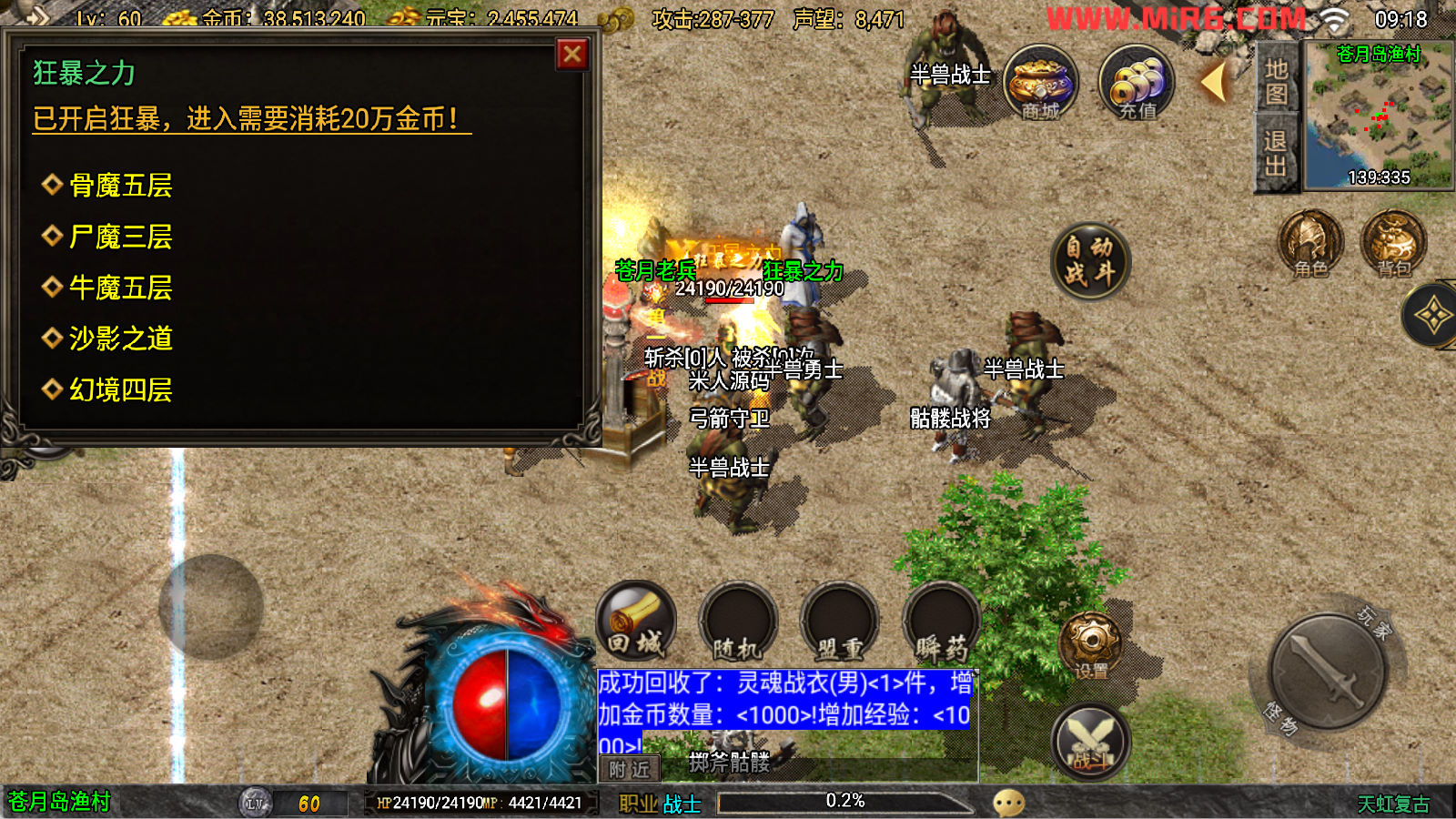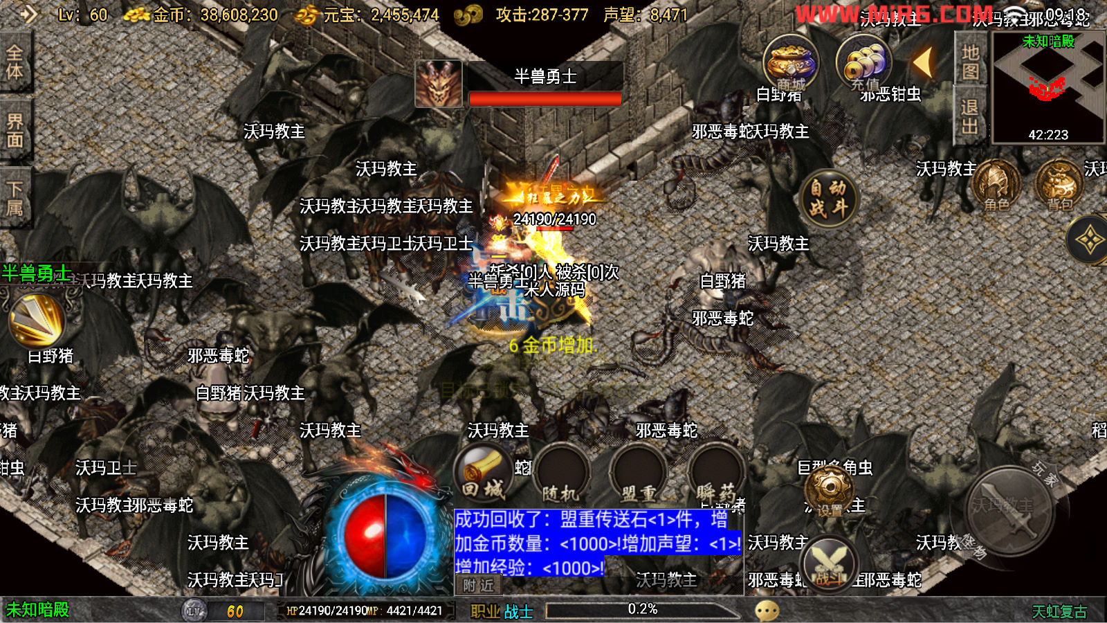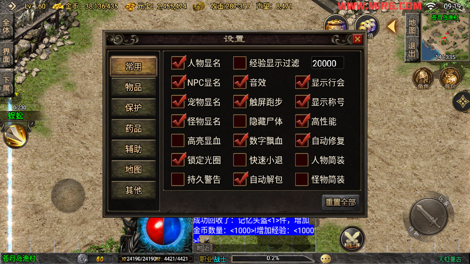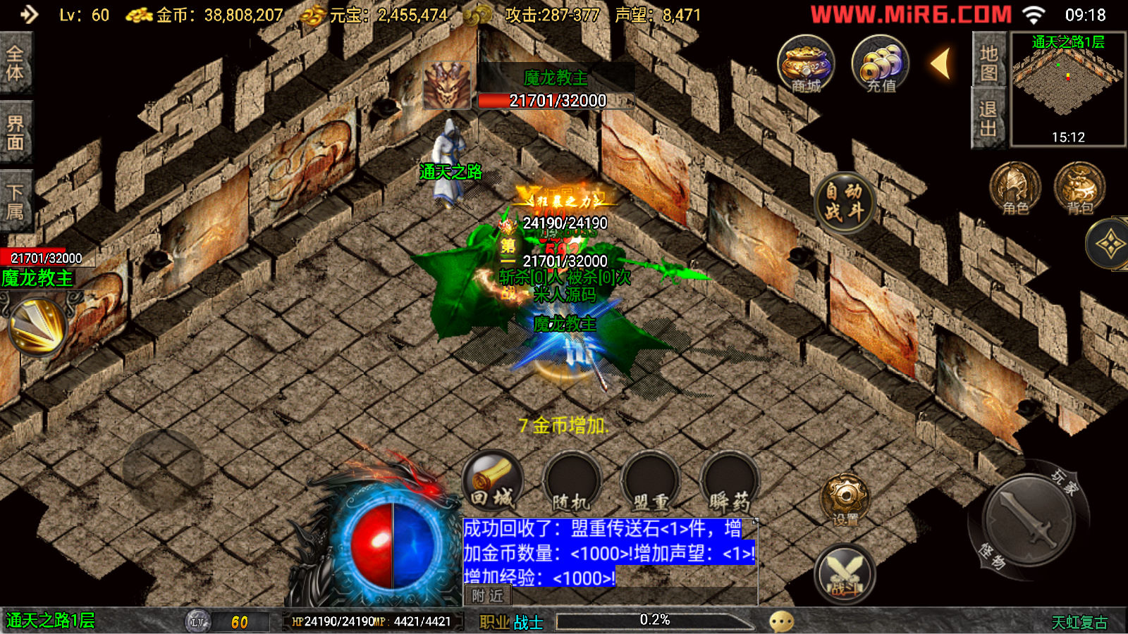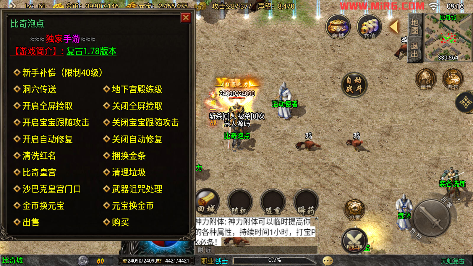 下面我们来测试下游戏里的功能看看吧。好了,其他功能就自行测试吧。更多的游戏资源可以访问www.MiR6.com下载,我们每款游戏资源均单独制作了独立的视频架设教程,让小白也可以快速上手游戏架设。快来体验自己做GM的乐趣吧!