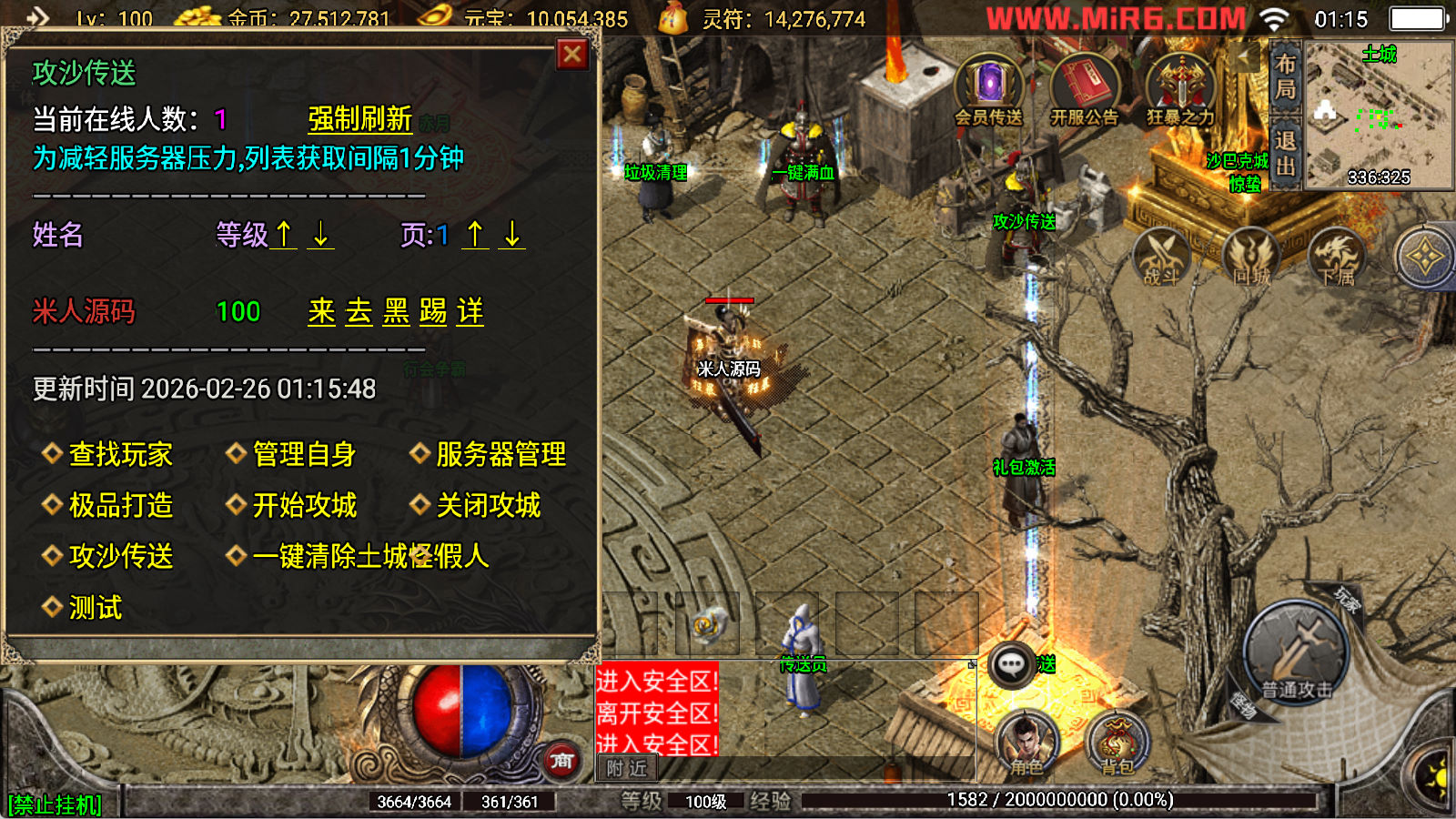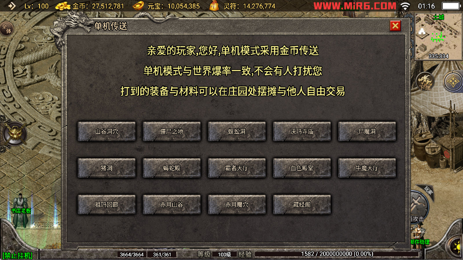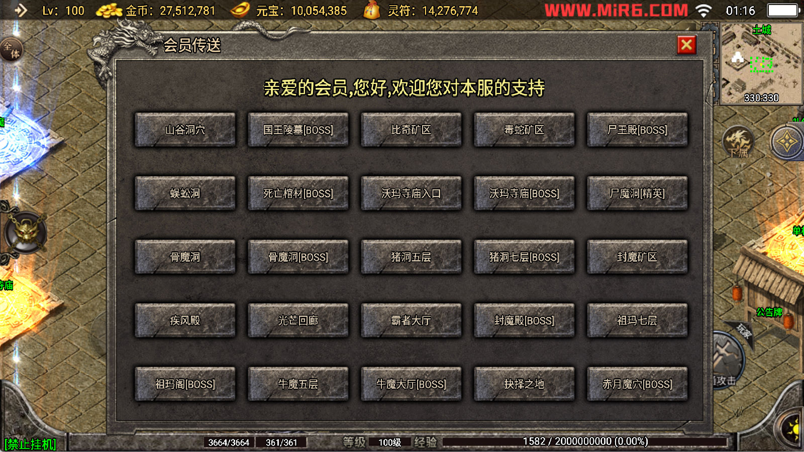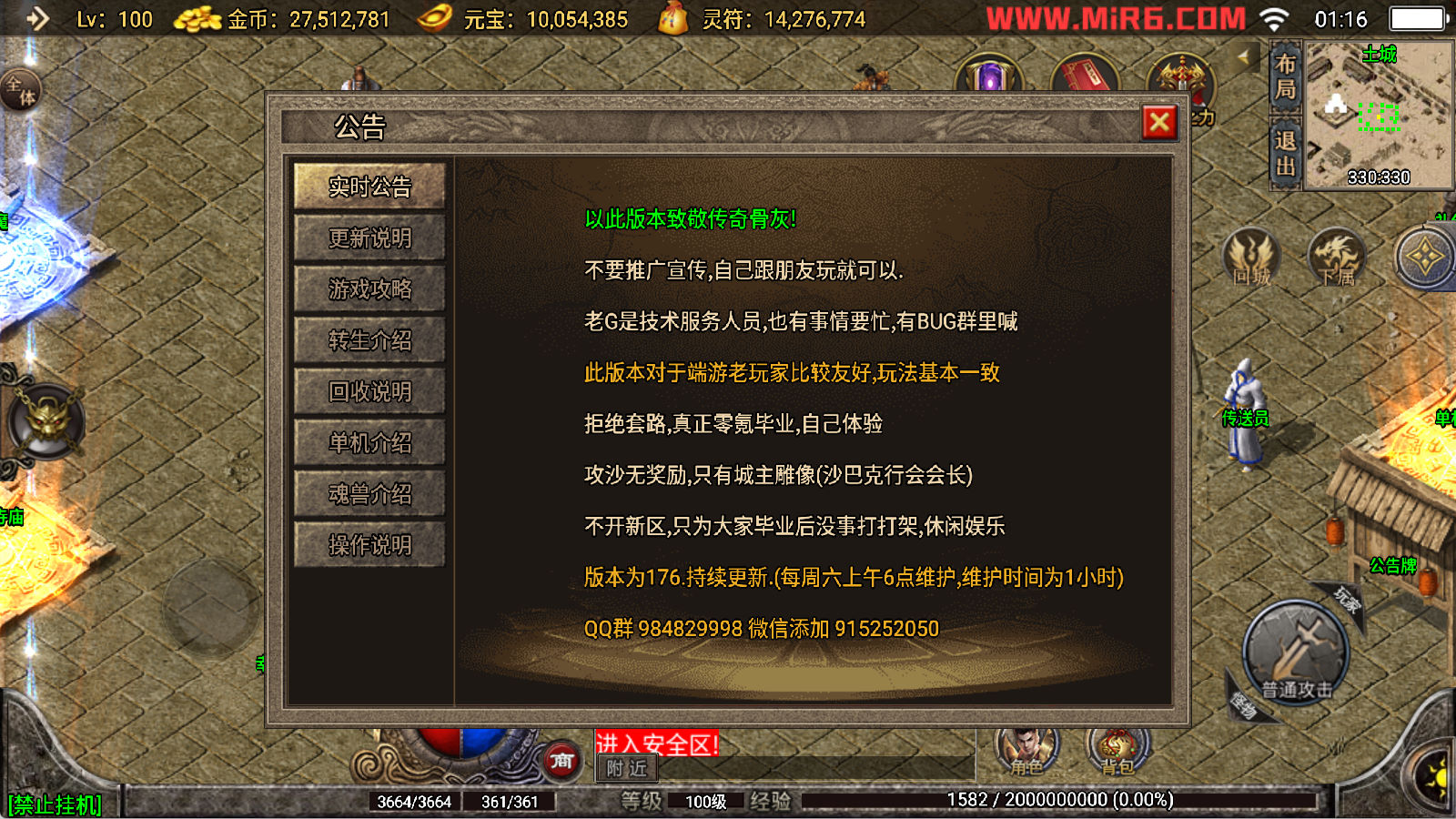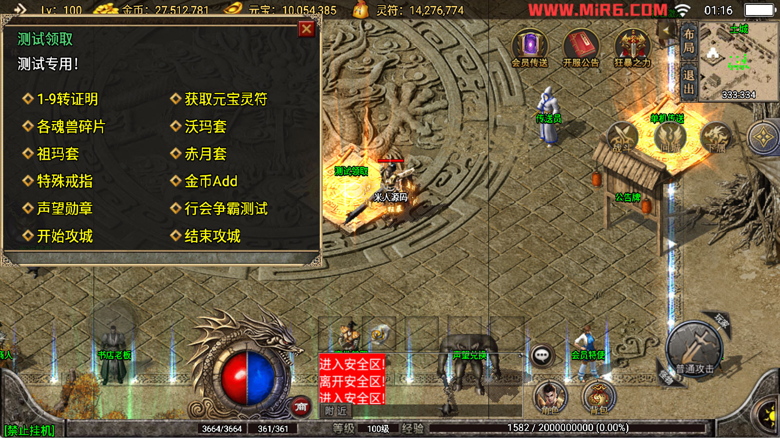 下面我们来测试下游戏里的功能看看。好了,其他功能就自行测试吧。更多的游戏资源可以访问www.MiR6.com下载,我们每款游戏资源均单独制作了独立的视频架设教程,让小白也可以快速上手游戏架设,快来体验自己做GM的乐趣吧!