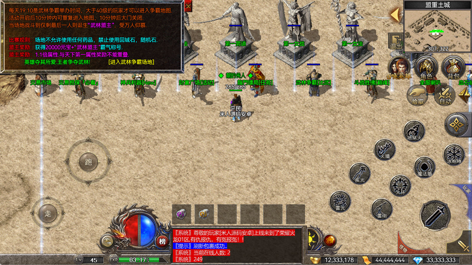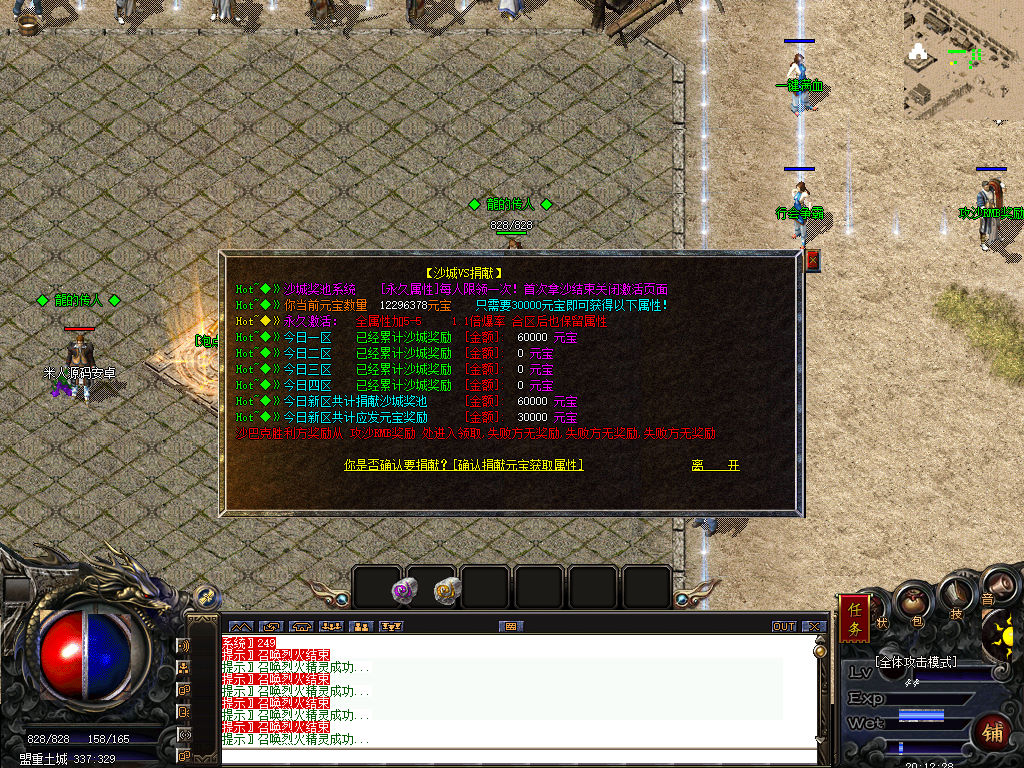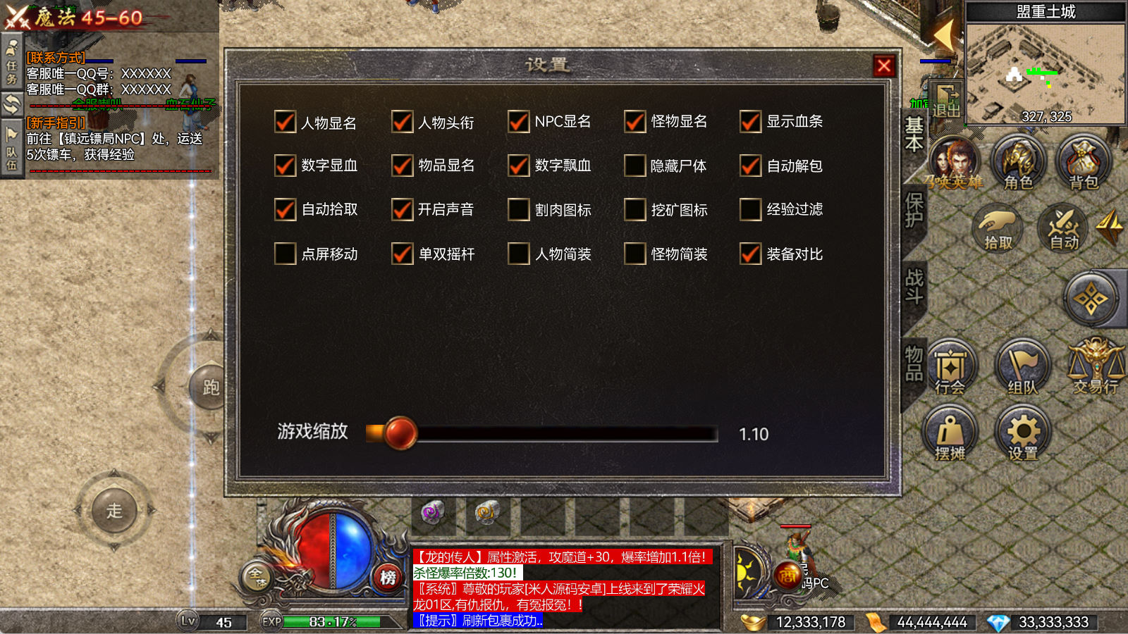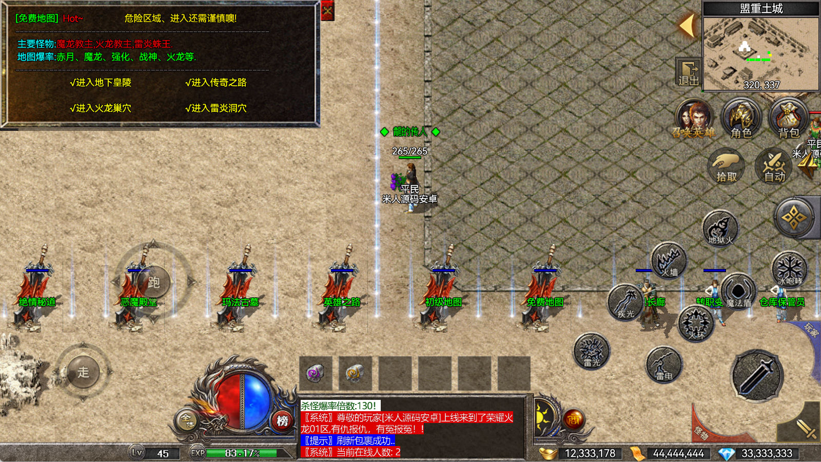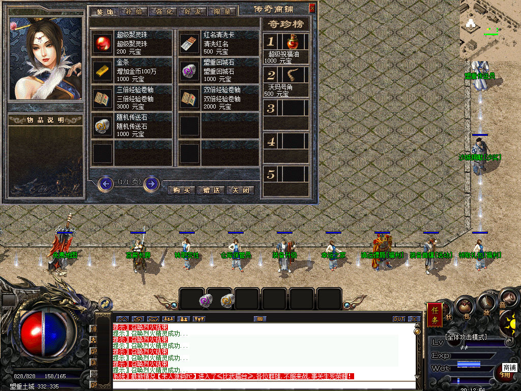 另外我这里的登陆器界面第一次进入界面显示是歪的,关闭后重新在进入即可正常了。我们先进入一次游戏。另外推荐,把盟重地图文件mp3\3.map替换到你的PC客户端里获的更好的游戏显示效果,其他补丁如果你看看有需要,可以从服务端里复制到PC客户端里完整替换一次获得更好的显示效果。