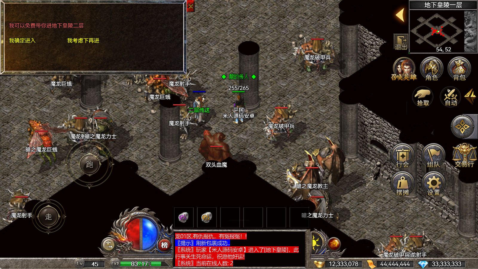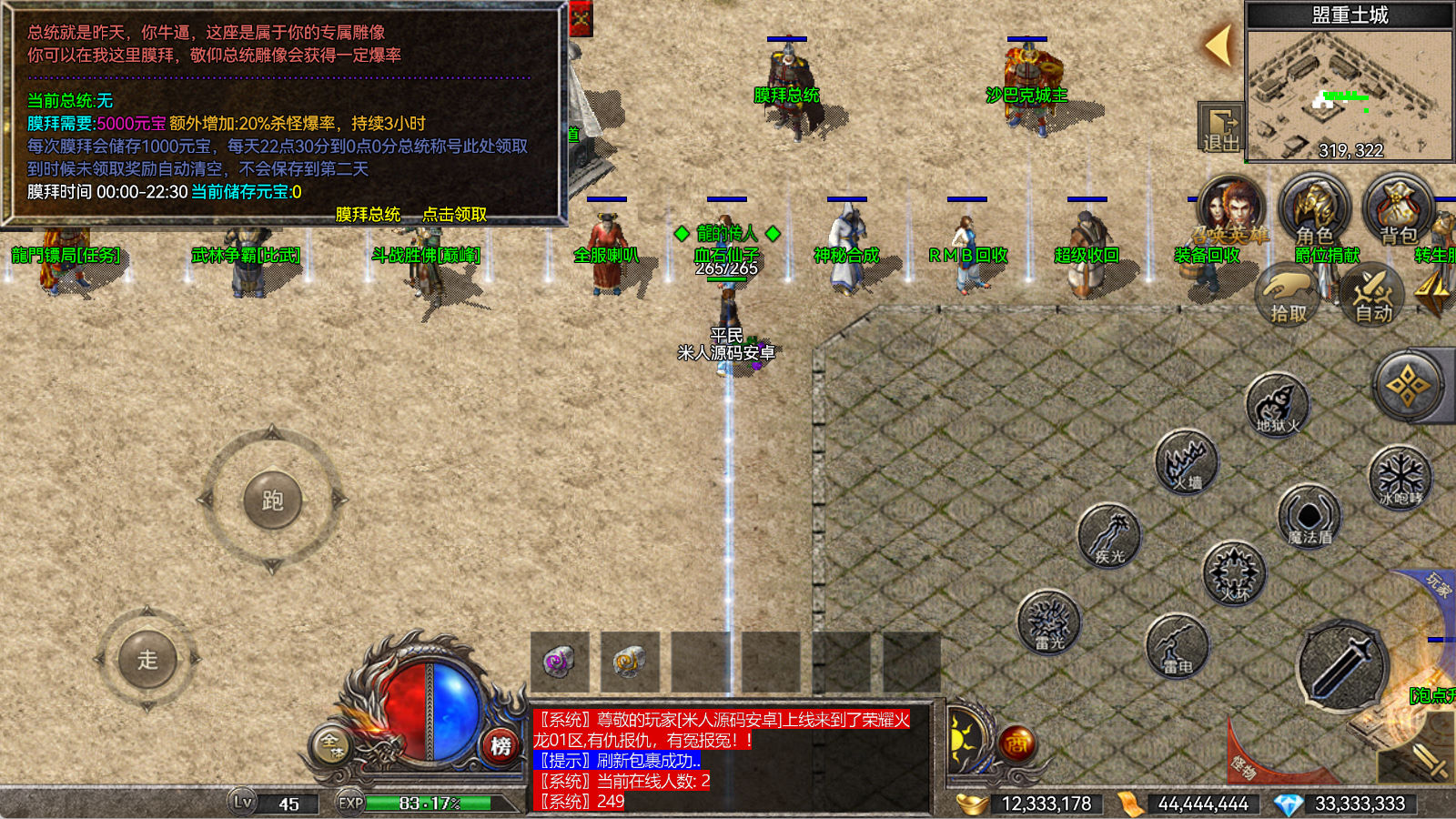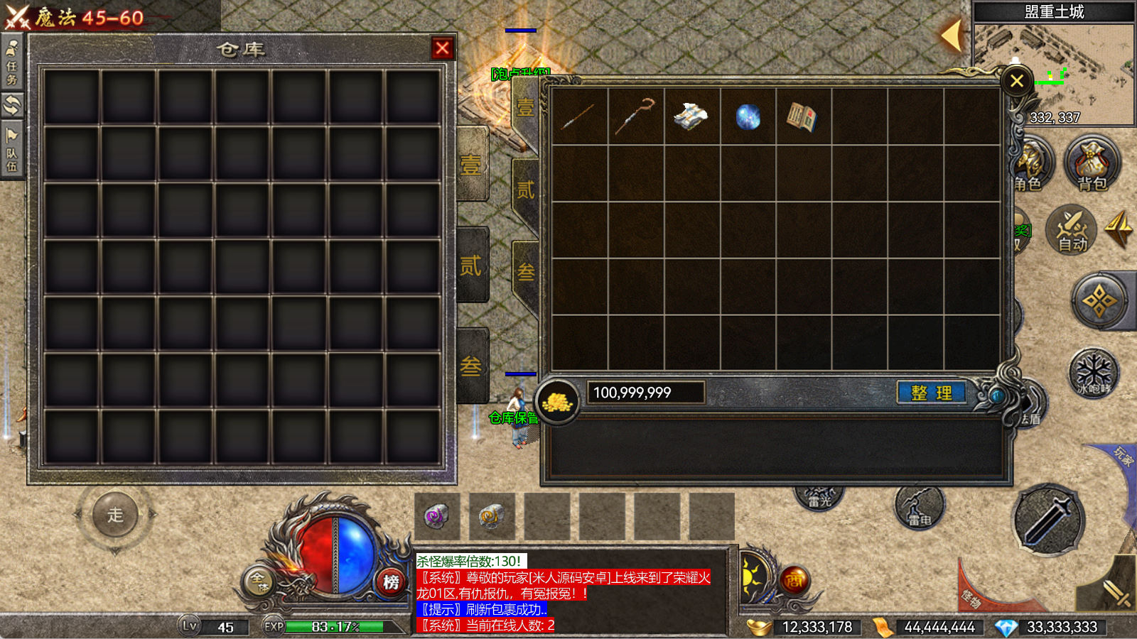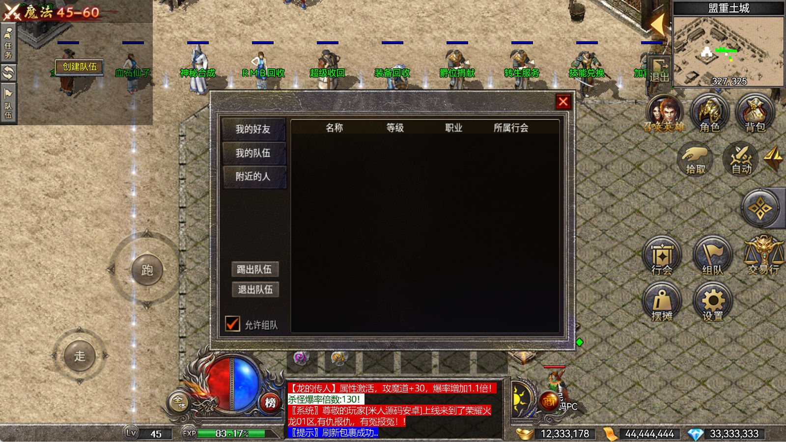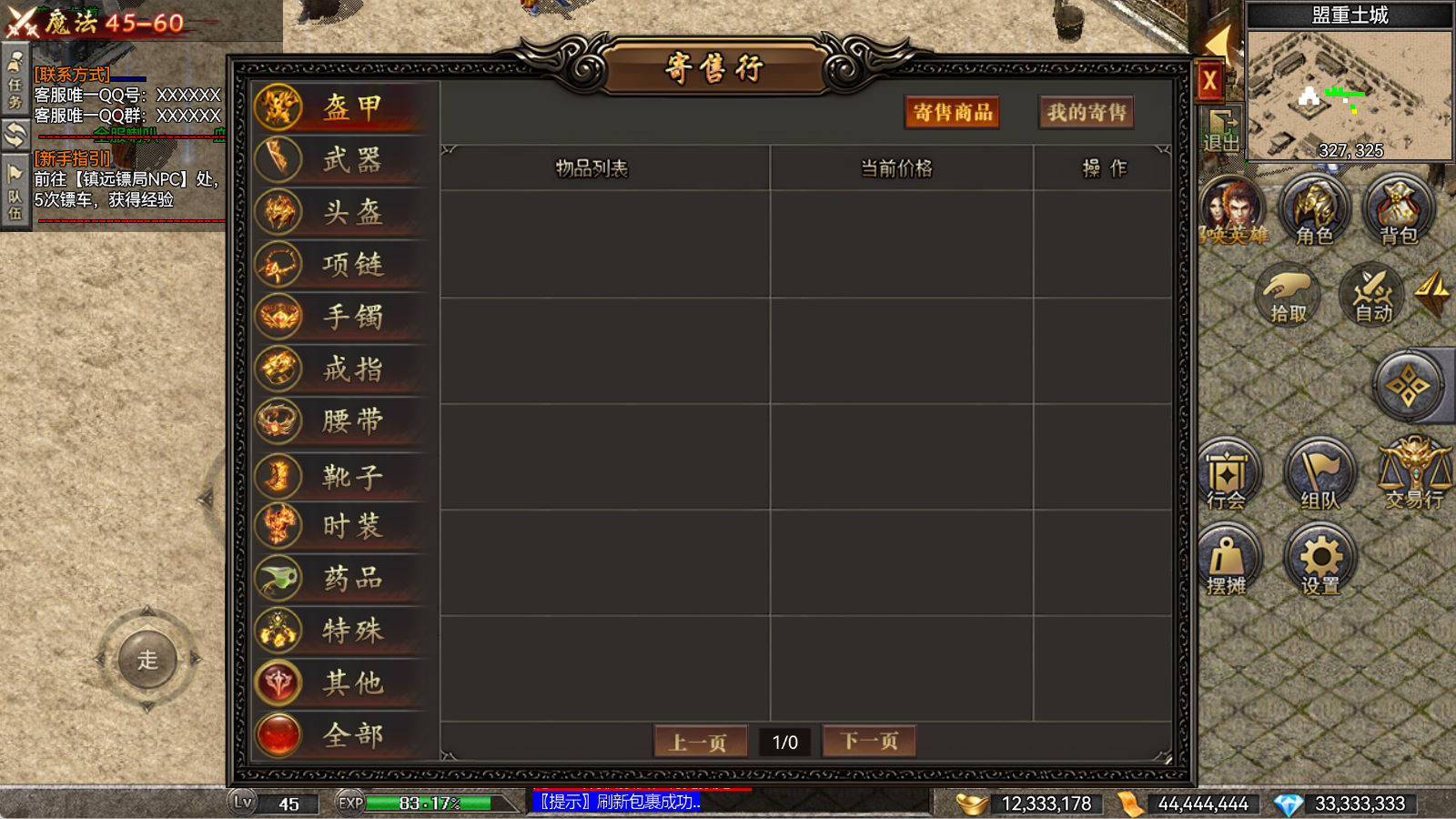 另外我这里的登陆器界面第一次进入界面显示是歪的,关闭后重新在进入即可正常了。我们先进入一次游戏。另外推荐,把盟重地图文件mp3\3.map替换到你的PC客户端里获的更好的游戏显示效果,其他补丁如果你看看有需要,可以从服务端里复制到PC客户端里完整替换一次获得更好的显示效果。