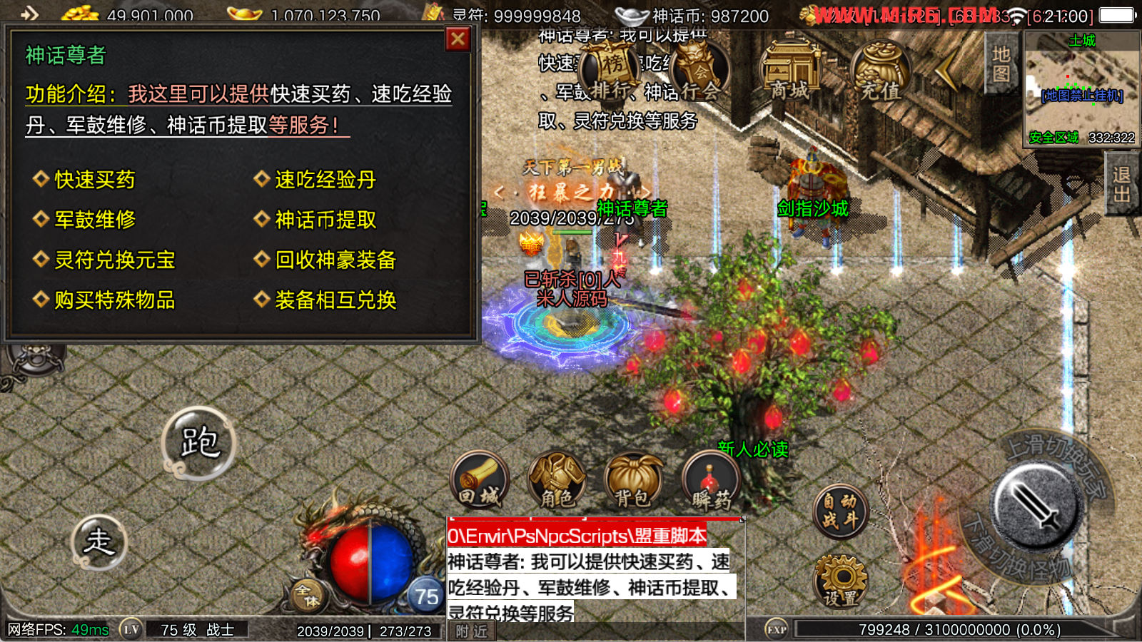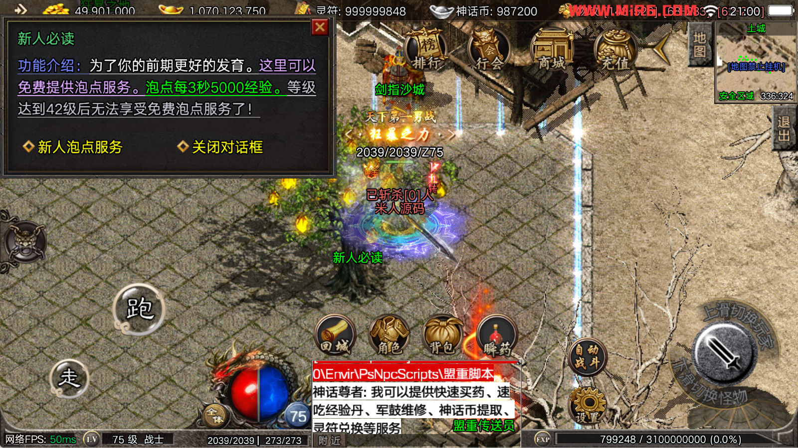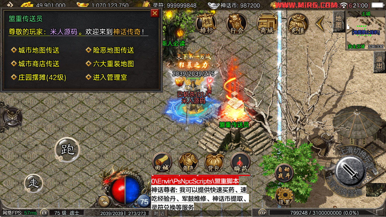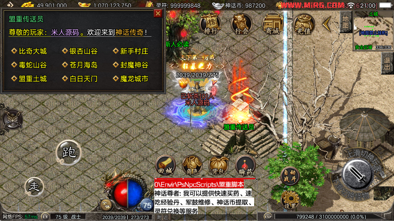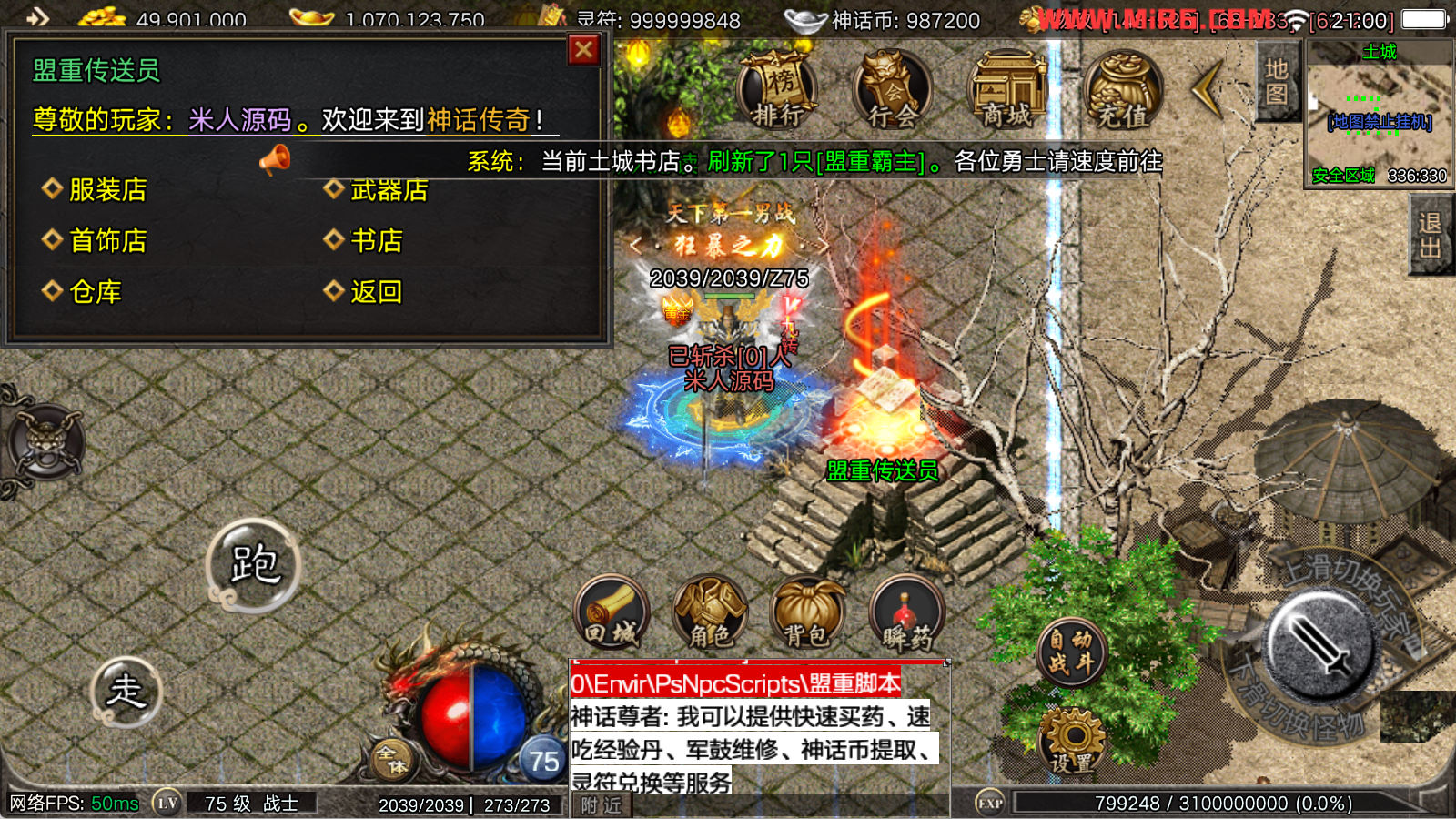 看到有很多眼神插件的NPC脚本命令会报错,功能无法使用,需要正版眼神授权才可以使用,介意请勿下载此端。我们设置GM账号,刷一个回城卷到盟重测试下其他功能。
