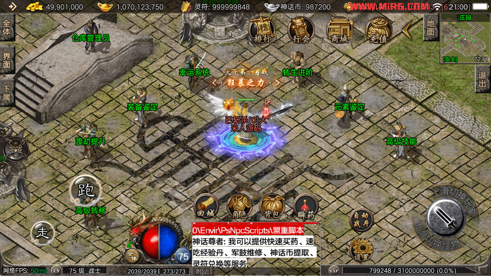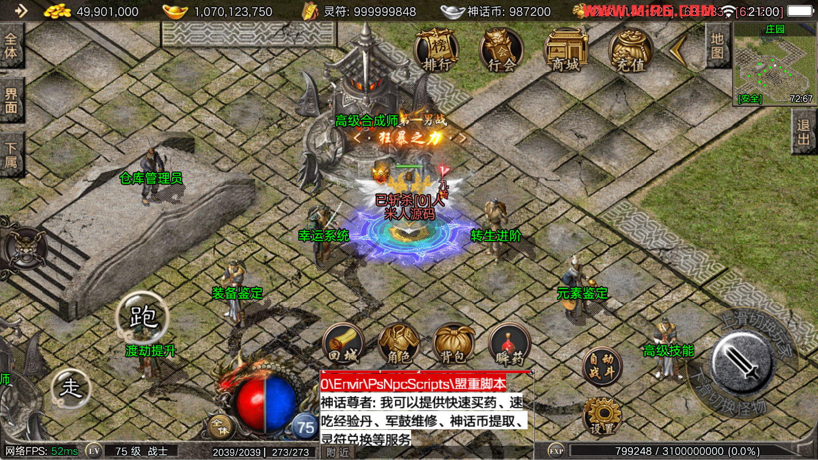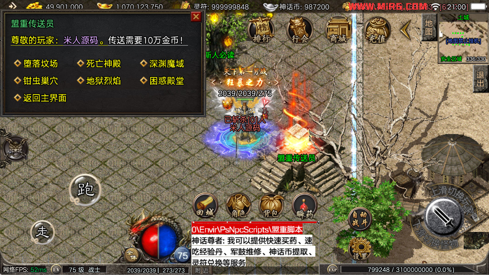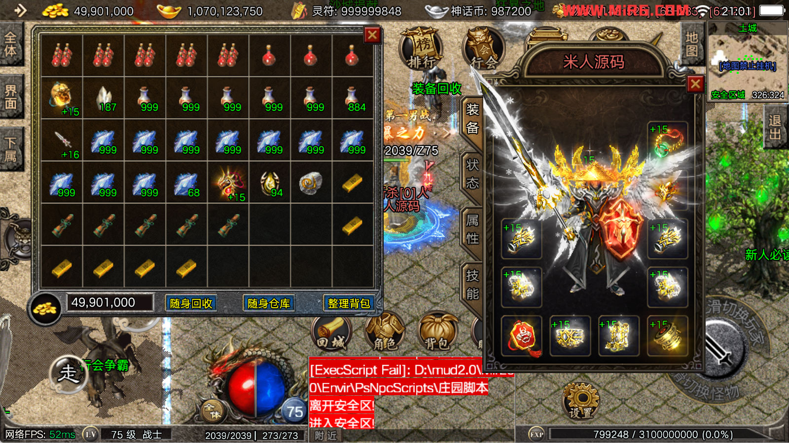 看到有很多眼神插件的NPC脚本命令会报错,功能无法使用,需要正版眼神授权才可以使用,介意请勿下载此端。我们设置GM账号,刷一个回城卷到盟重测试下其他功能。
