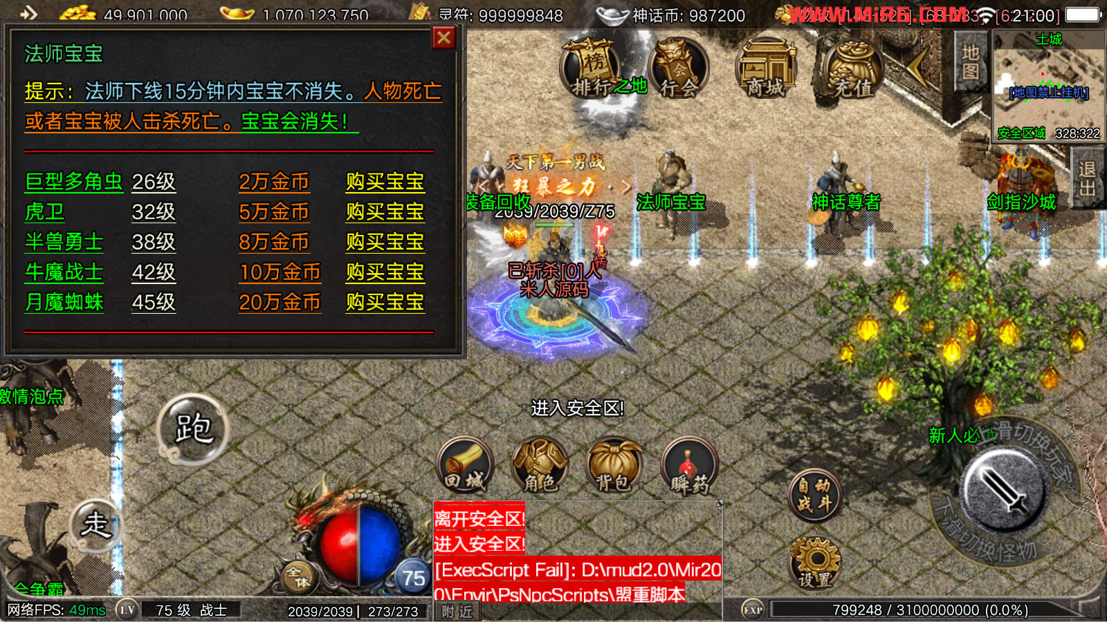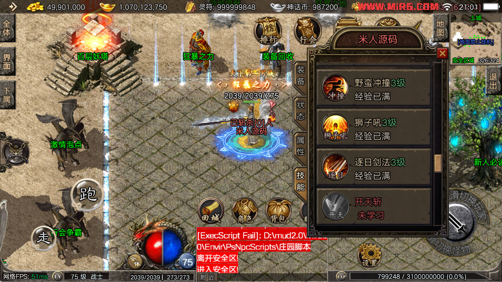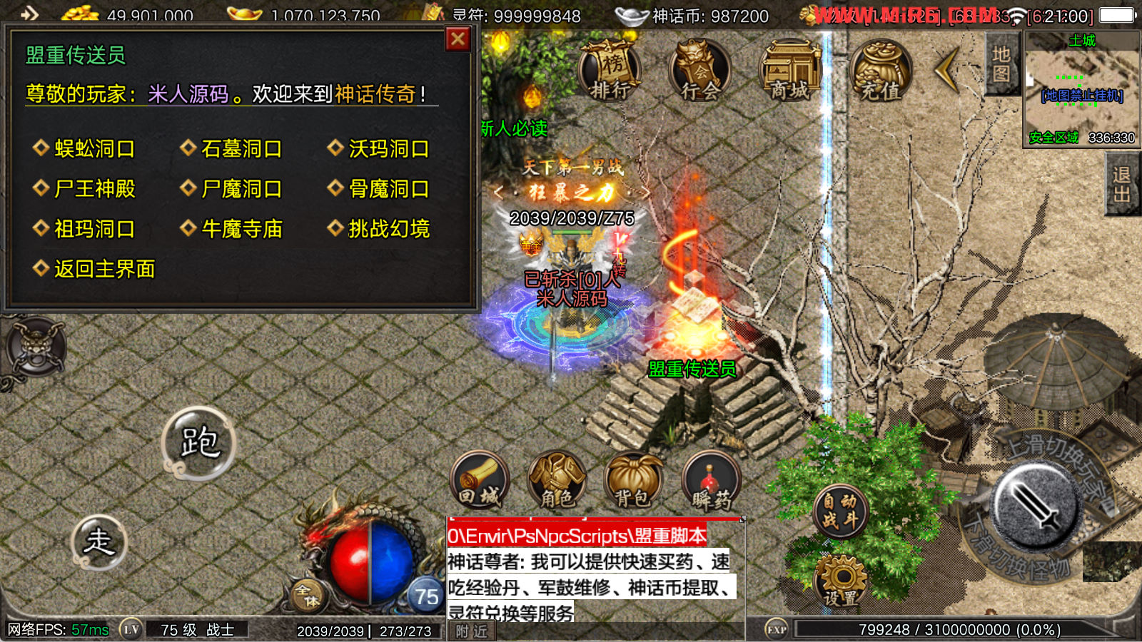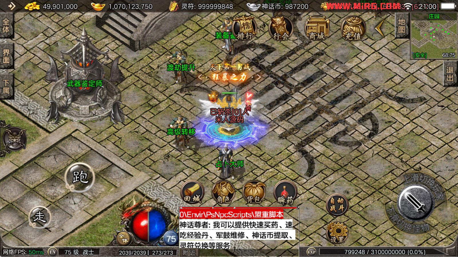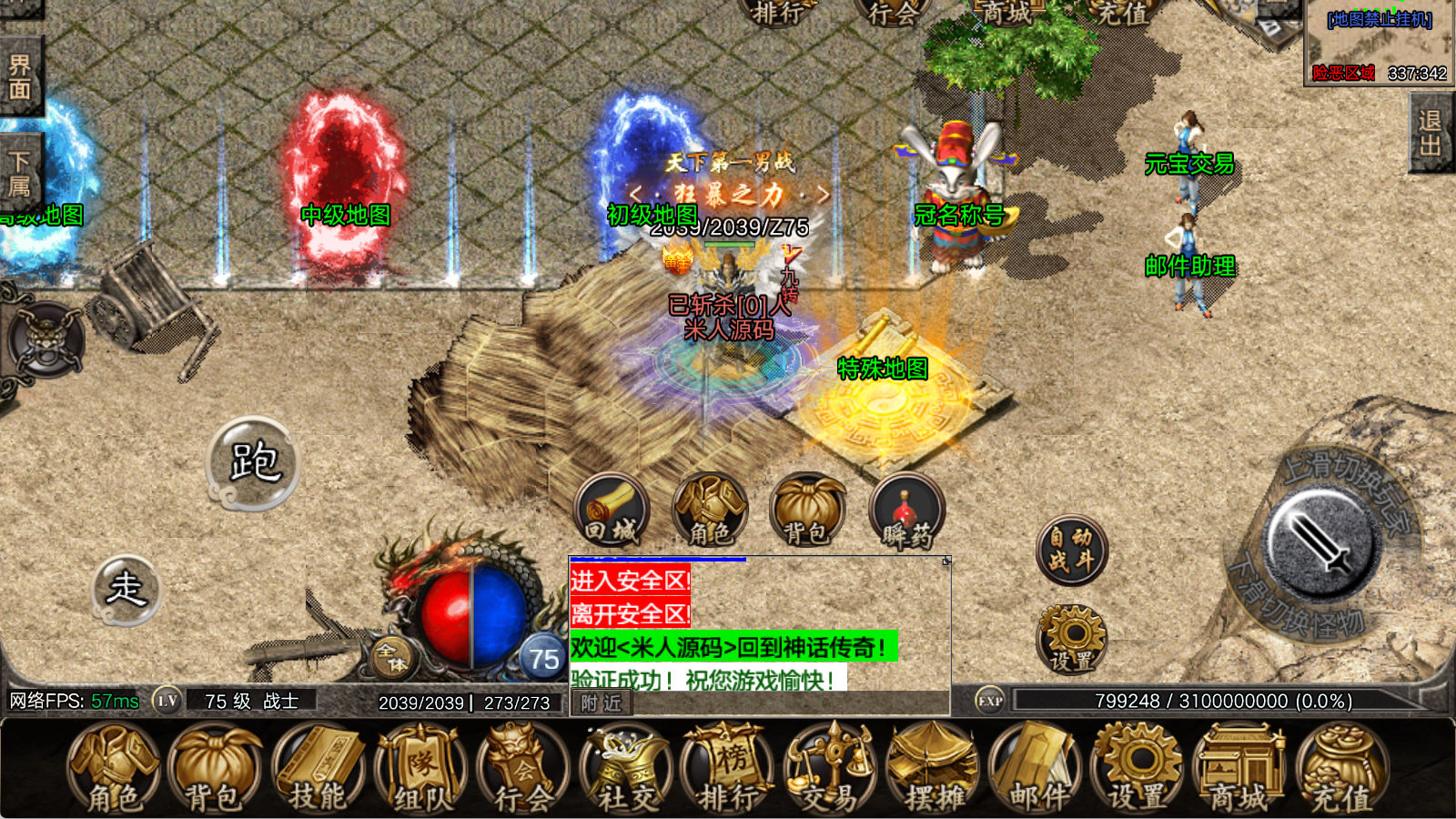看到有很多眼神插件的NPC脚本命令会报错,功能无法使用,需要正版眼神授权才可以使用,介意请勿下载此端。我们设置GM账号,刷一个回城卷到盟重测试下其他功能。