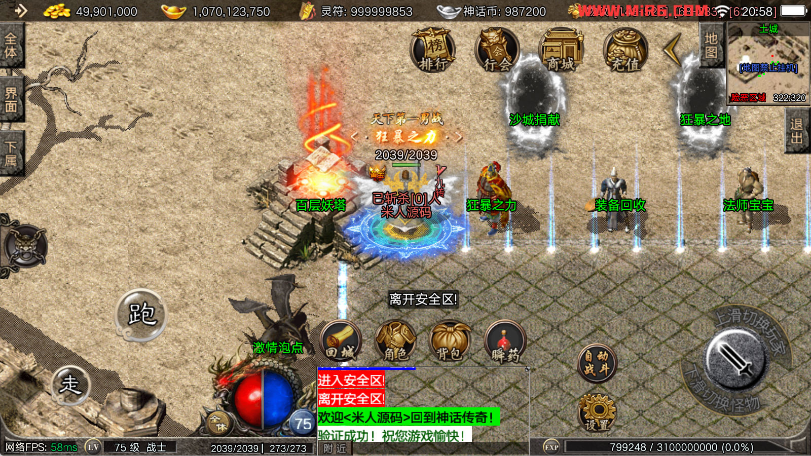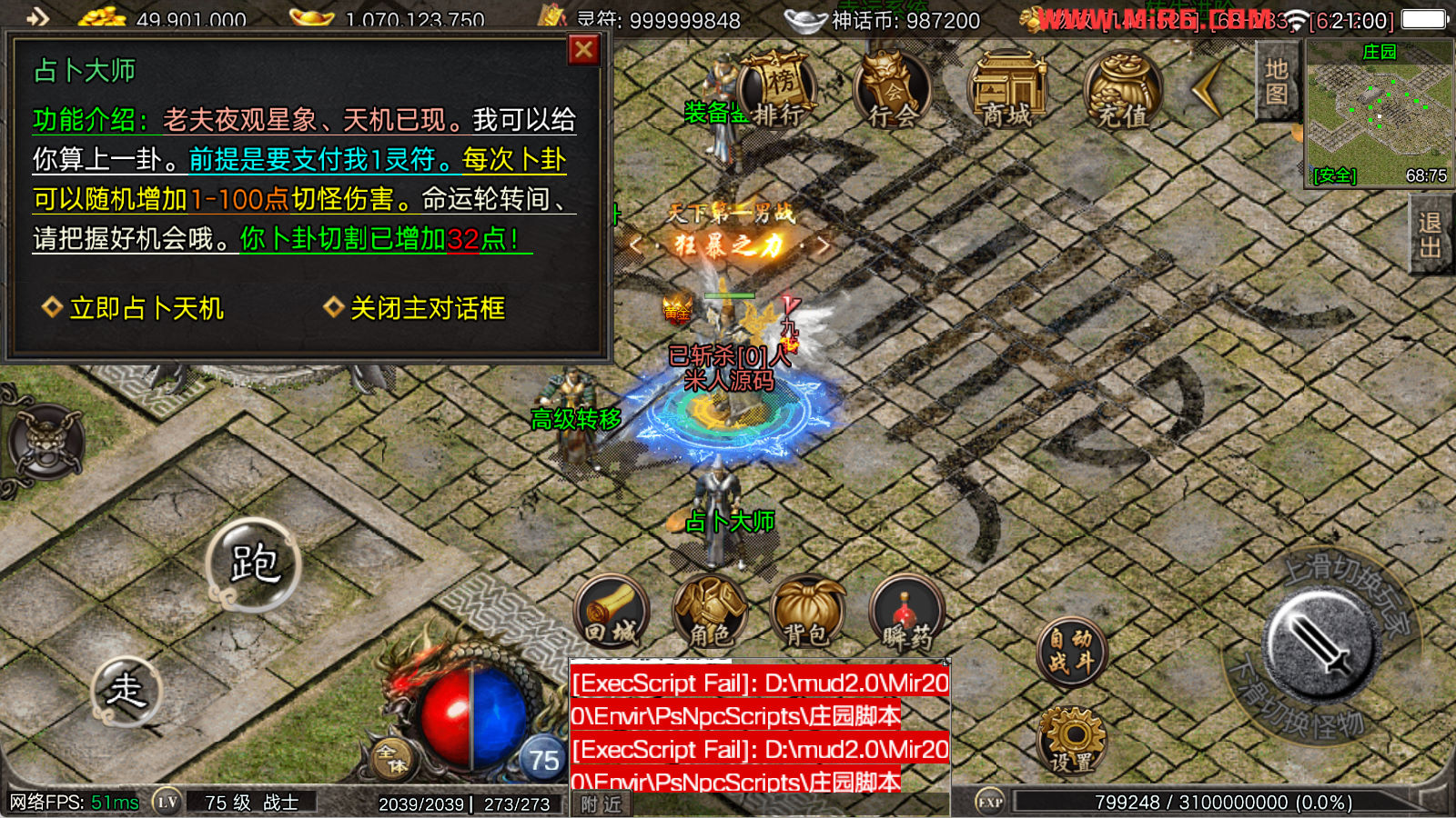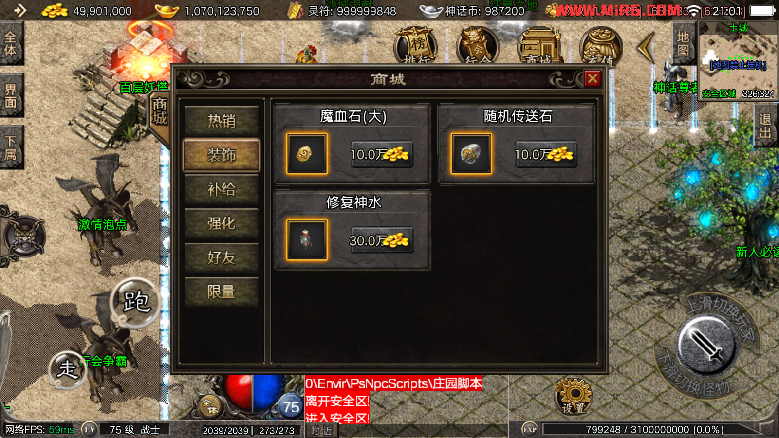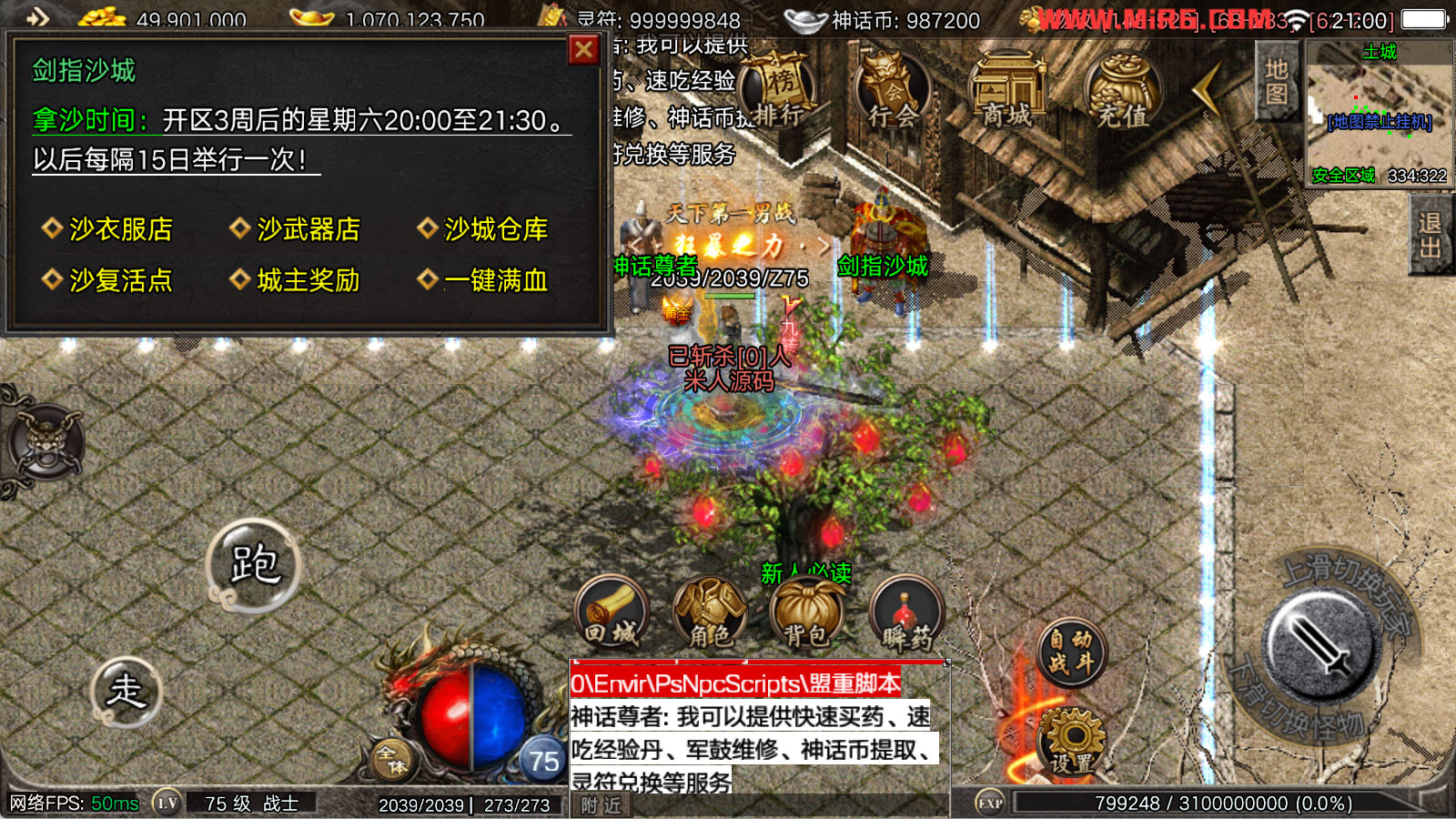 看到有很多眼神插件的NPC脚本命令会报错,功能无法使用,需要正版眼神授权才可以使用,介意请勿下载此端。我们设置GM账号,刷一个回城卷到盟重测试下其他功能。