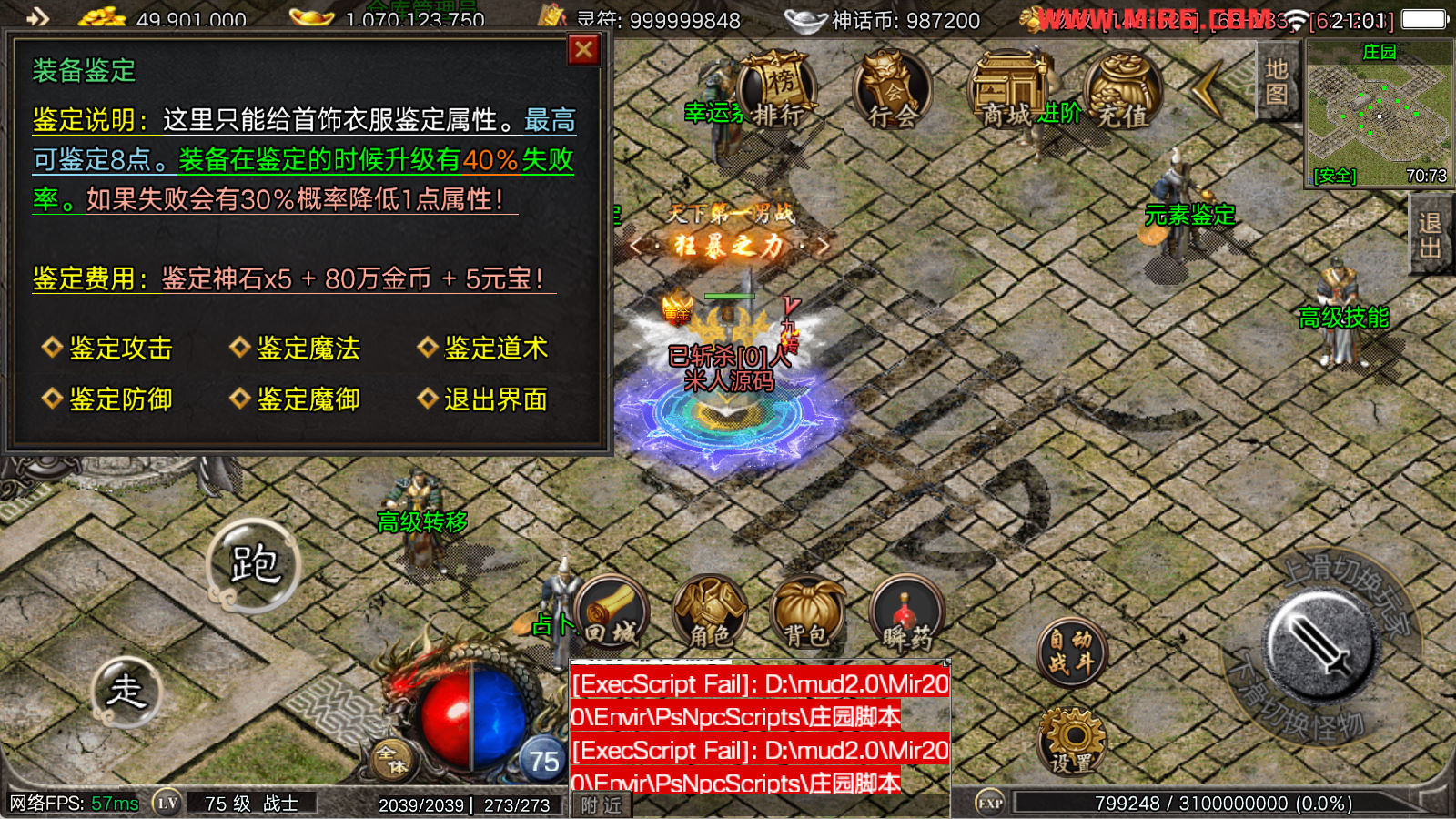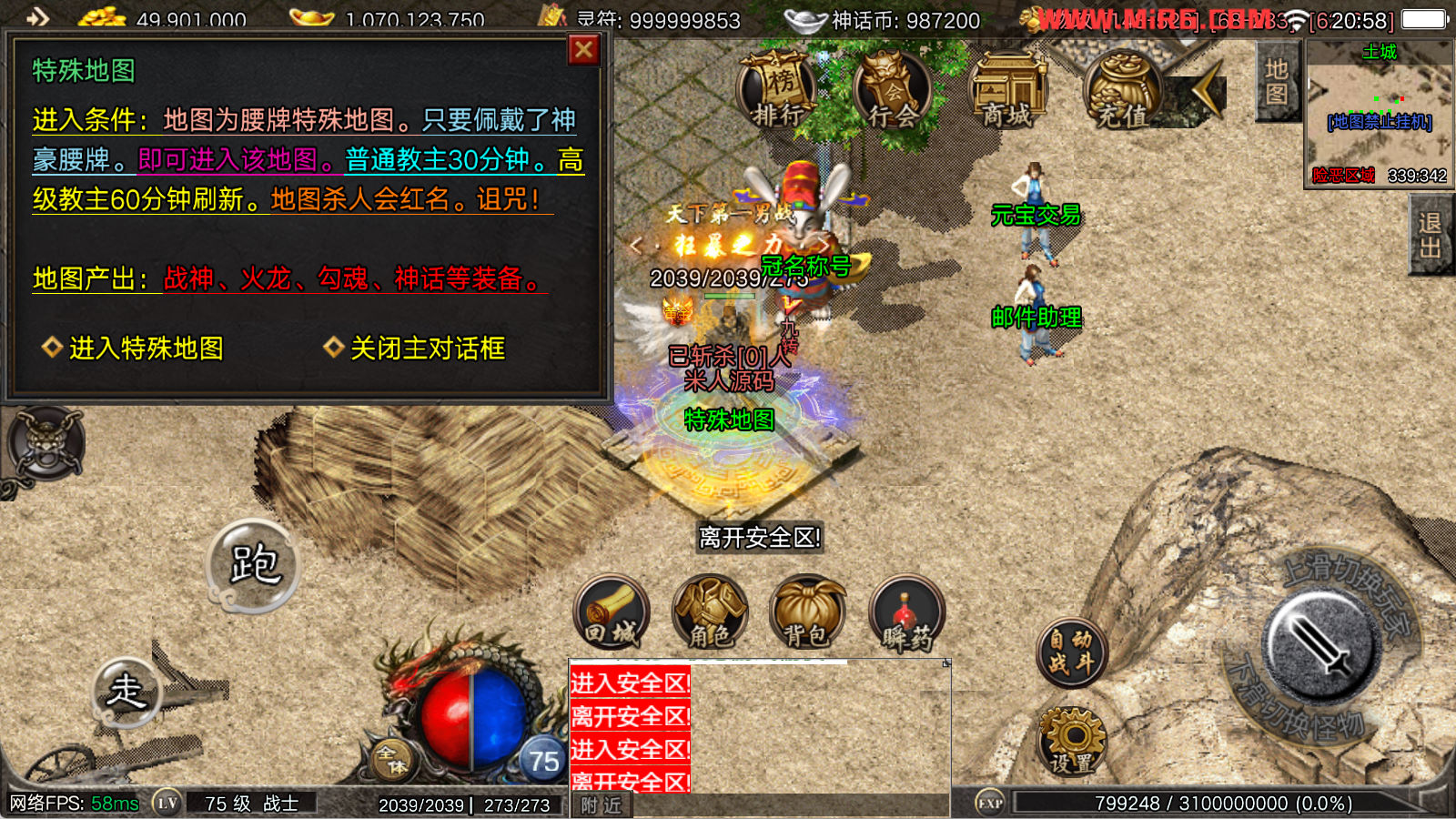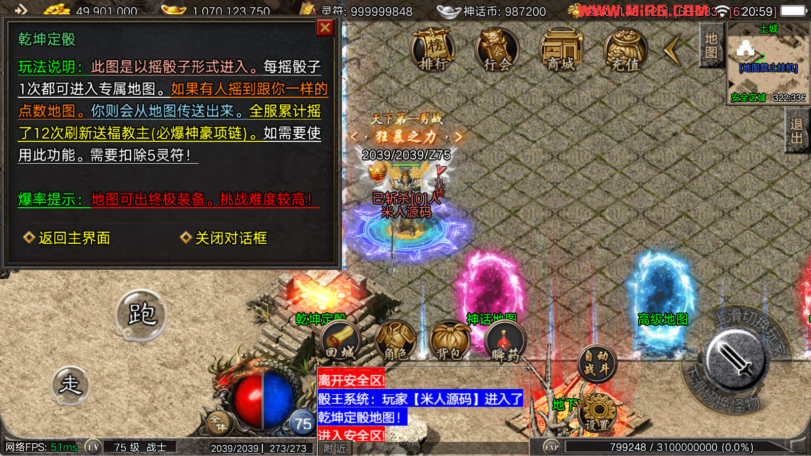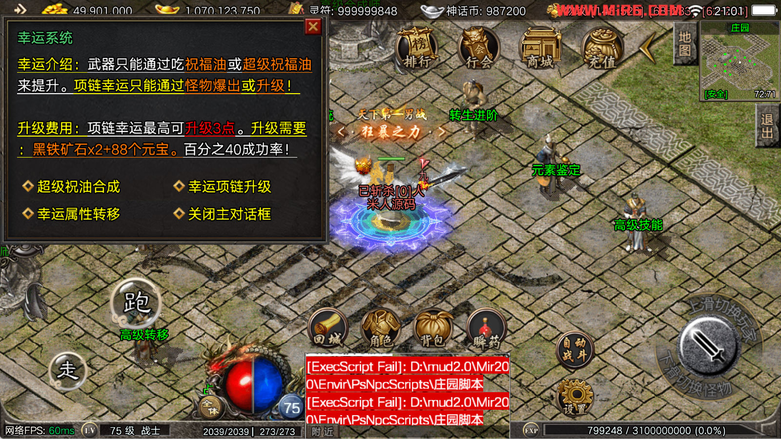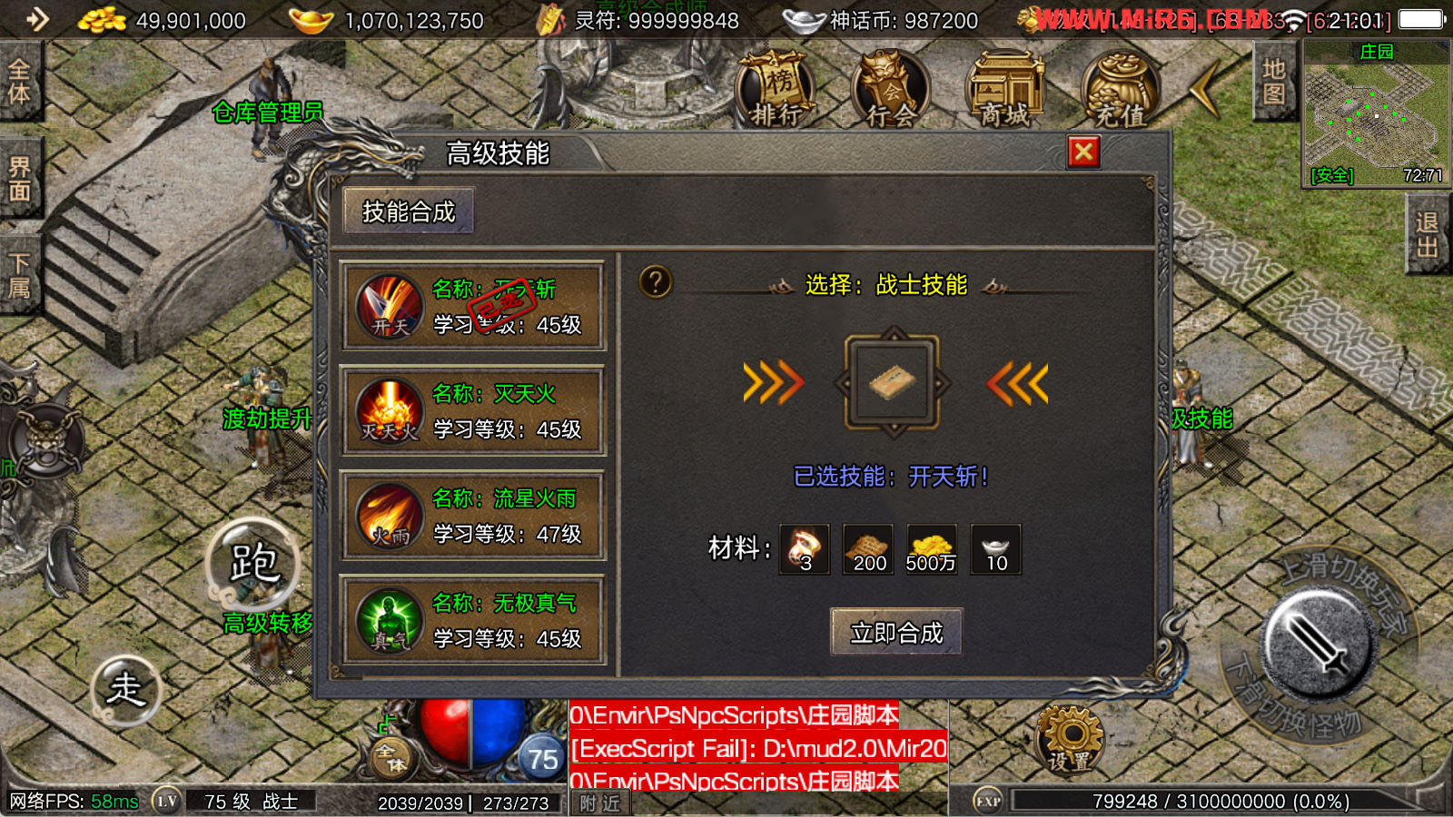 看到有很多眼神插件的NPC脚本命令会报错,功能无法使用,需要正版眼神授权才可以使用,介意请勿下载此端。我们设置GM账号,刷一个回城卷到盟重测试下其他功能。