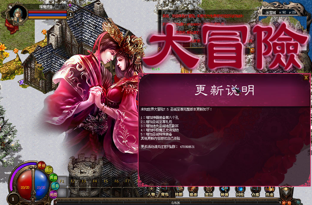 《未知世界大冒险》是国内玩家自制的一款角色扮演游戏,是经典网游《传奇》的单机版,和其他单机版本不一样,里面融入了许多火影的元素,游戏完全免费,新的装备分级以及宠物系统,经典的游戏画面,华丽的技能以及副本,更多的假人陪玩家一起游戏,让你领略不一样的单机传奇,找回当年的感动,目前打到40级可赠送翅膀装备。加入官方Q群以便第一时间获取最新更新以及活动福利。
